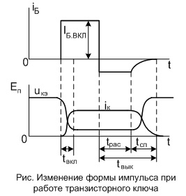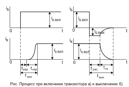 Процессы включения и выключения транзисторного ключа показаны на рисунке. При включении транзистора рисунок а в его базу подается прямоугольный импульс тока с крутым фронтом. Ток коллектора достигает установившегося значения не сразу после подачи тока в базу. Имеется некоторое время задержки tЗАД, спустя которое появляется ток в коллекторе. Затем ток в коллекторе плавно нарастает и после времени tНАР достигает установившегося значения IК.ВКЛ, таким образом