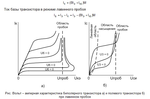 Пробой в транзисторе имеет некоторые особенности, связанные с взаимным влиянием эмиттерного и коллекторного переходов. Пробивное напряжение коллектор-эмиттер всегда меньше пробивного напряжения коллекторного перехода. Это объясняется влиянием эмиттерного перехода на коллекторный. Ток коллектора транзистора с учетом коэффициента лавинного размножения носителей определяется формулой